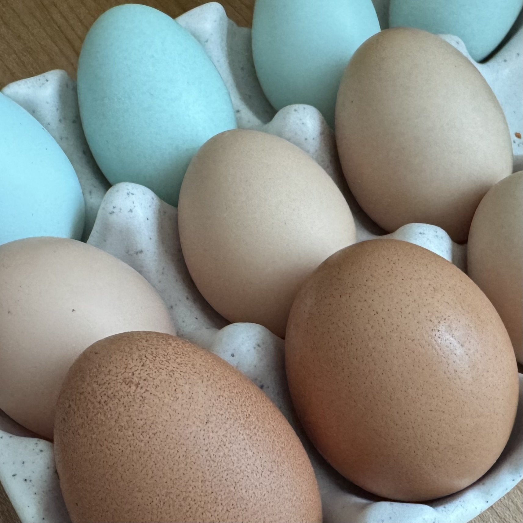 Different chicken breeds lay different color eggs. We have many different types of chickens, which we chose on purpose so that we can tell each other apart. They are pets after all. Each one has a name and their own personality. Muddy likes to peck people to tell them she loves them. She lays brown eggs with tiny spots.